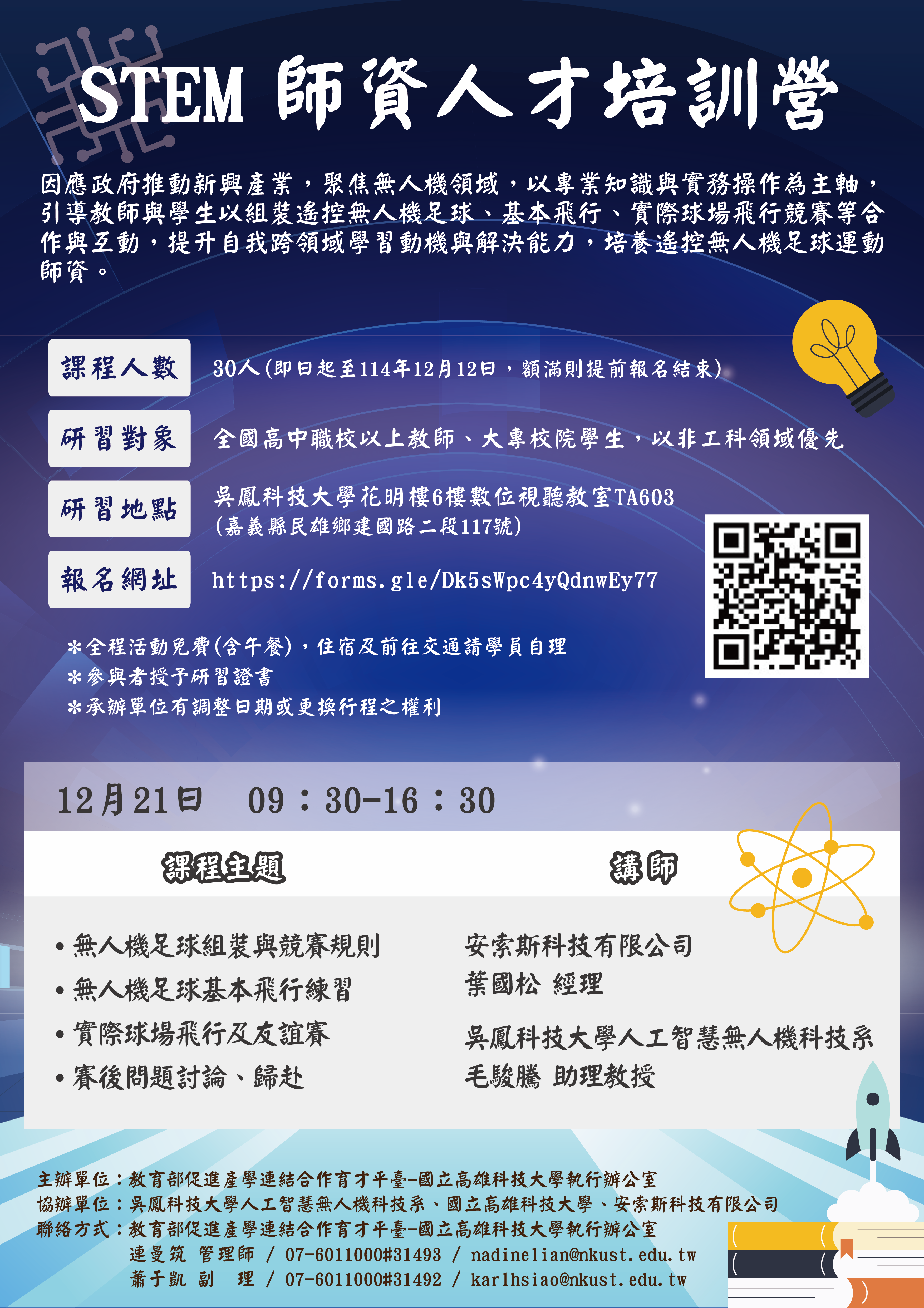 轉知教育部促進產學連結合作育才平臺之國立高雄科技大學執行辦公室與吳鳳科技大學共同辦理「STEM師資人才培訓營」。