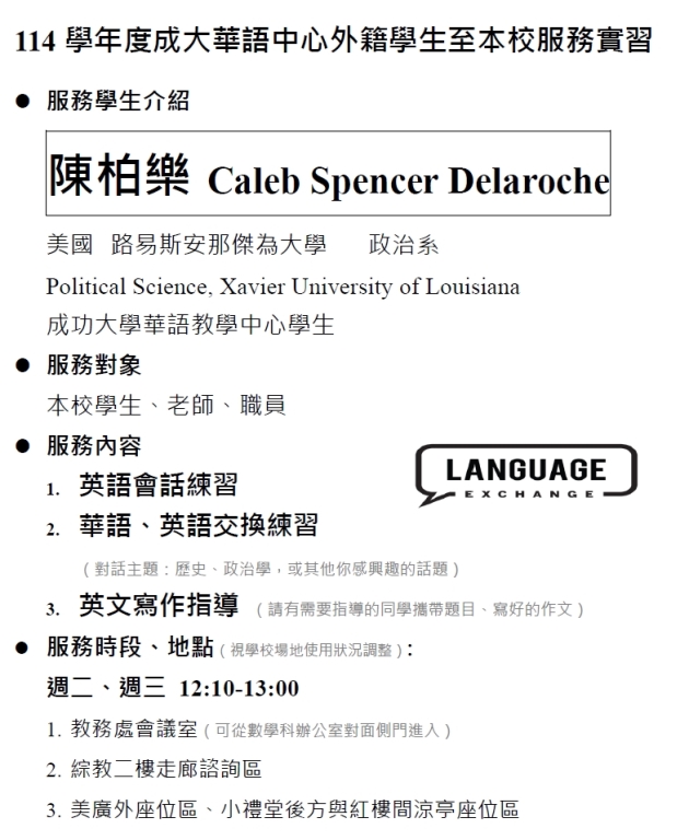 陳柏樂 Caleb Spencer Delaroche 美國 路易斯安那傑為大學 Xavier University of Louisiana International Studies