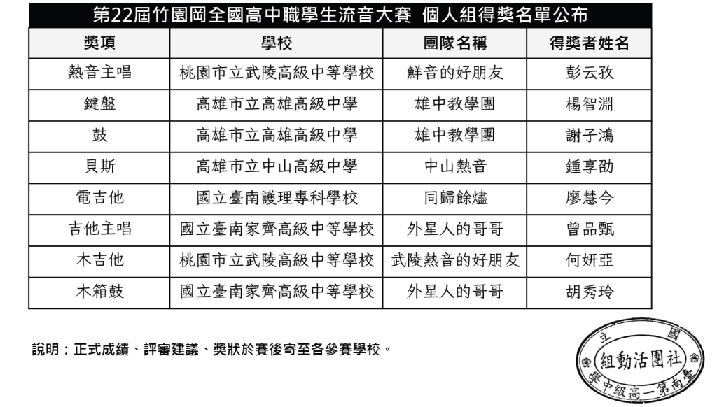 公告:第22屆竹園岡全國高中職學生流音大賽得獎名單公布