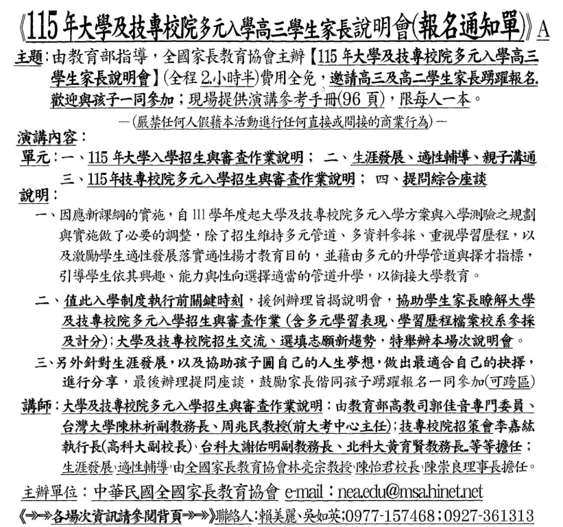 轉知:全國家長教育協會辦理115年大學多元入學高三家長說明會