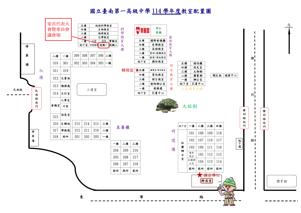 感謝您參與本週六(9/27)上午舉行的臺南一中114學年度親職教育座談會,以及下午1:00舉行的家長代表大會暨委員會議。當日簡要時程如下,另附上簡易校園平面圖,請您參考。