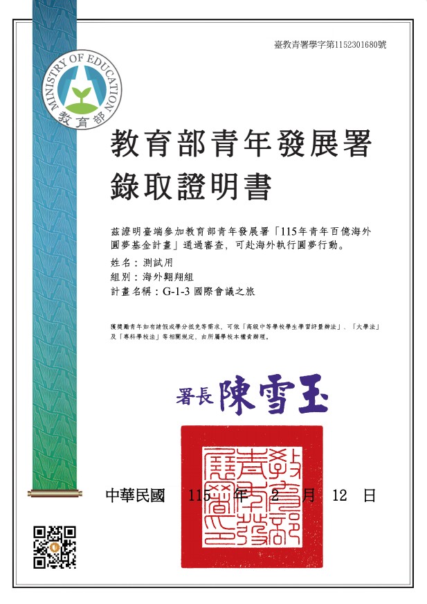轉知:教育部青年發展署「青年百億海外圓夢基金計畫」錄取證明書範本1份