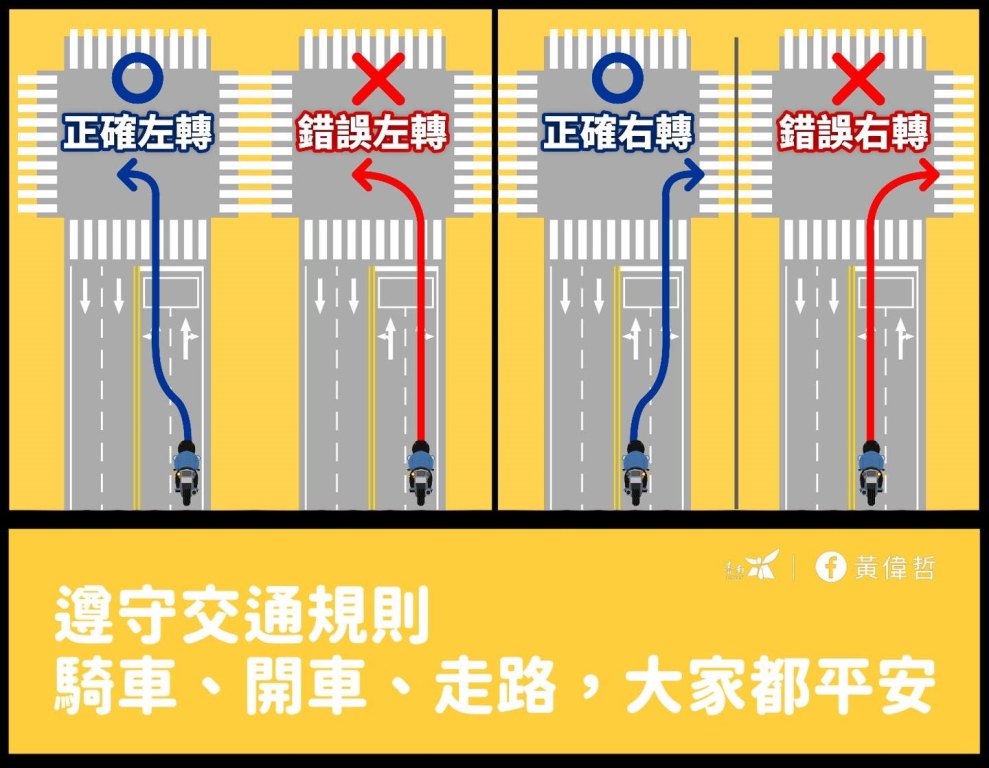 一、本次宣導主題:「單向兩車道路段機車左轉!如路口有機車兩段式左轉標誌,機車仍須依兩段式左轉規定左轉;如沒有機車兩段式左轉標誌,機車可以於內側車道左轉」。