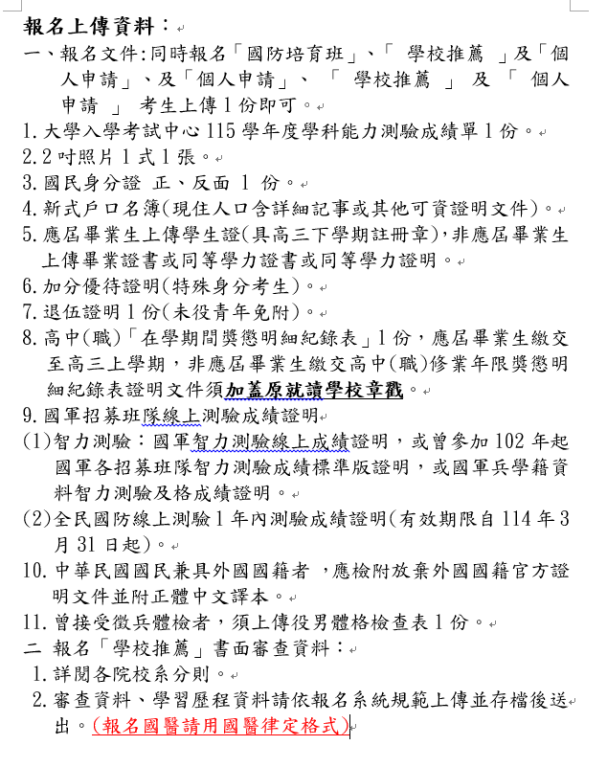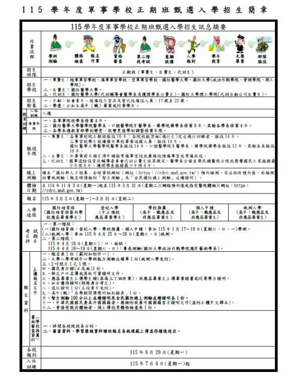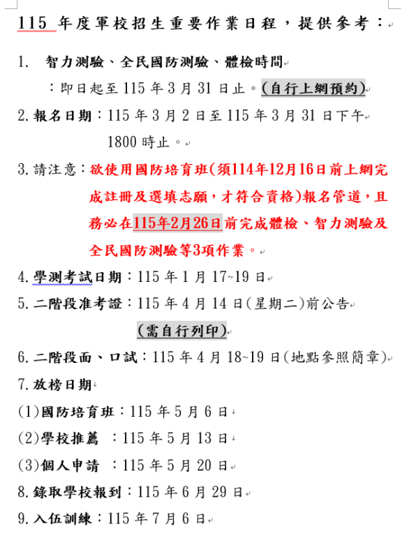 3.請注意:欲使用國防培育班(須114年12月16日前上網完成註冊及選填志願,才符合資格)報名管道,且務必在115年2月26日前完成體檢、智力測驗及全民國防測驗等3項作業。