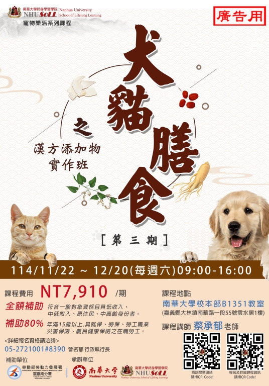 南華大學114年11-12月份開辦之犬貓膳食之漢方添加物實作班第03期課程資訊