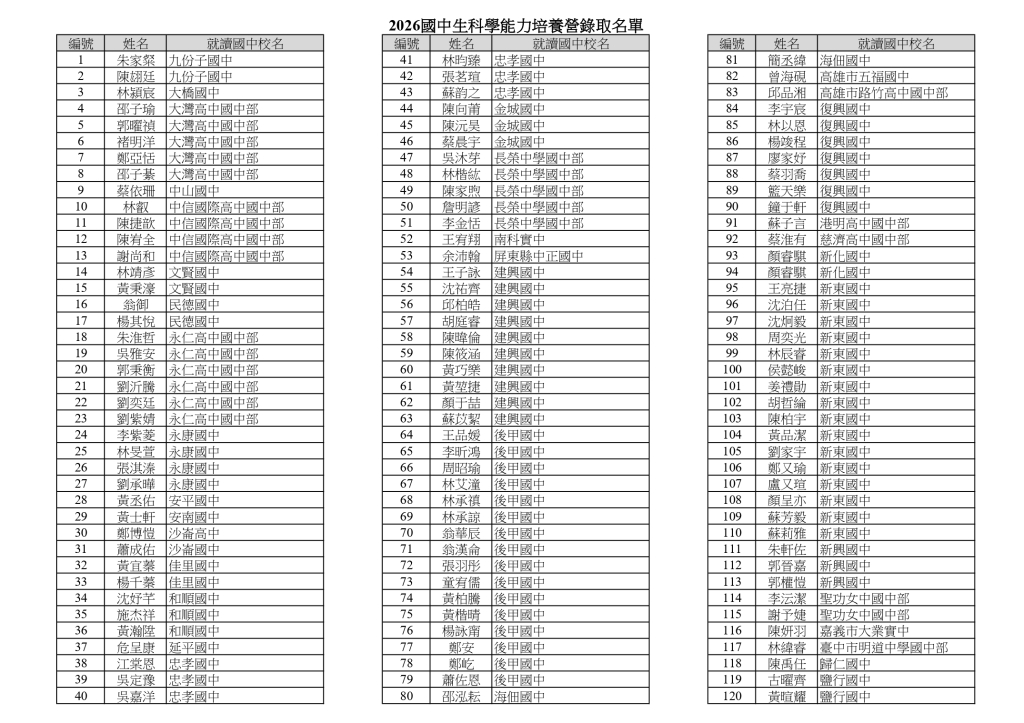 2026國中生科學能力培養營錄取名單如右表,